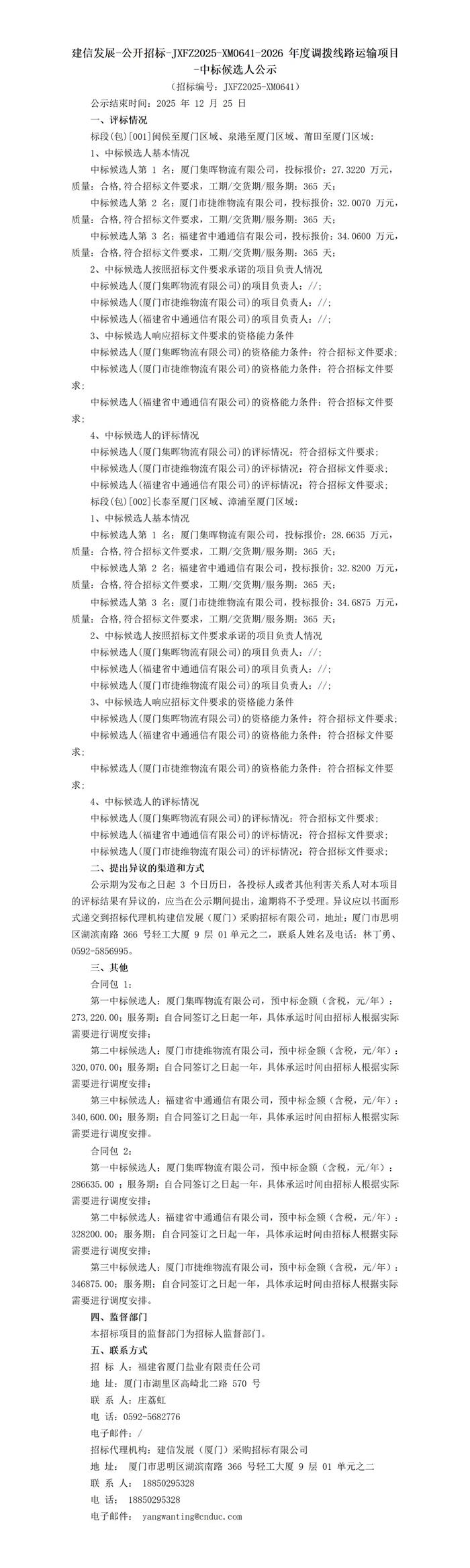 福建省廈門鹽業(yè)有限責(zé)任公司2026年度調(diào)撥線路運(yùn)輸項(xiàng)目中標(biāo)候選人公示